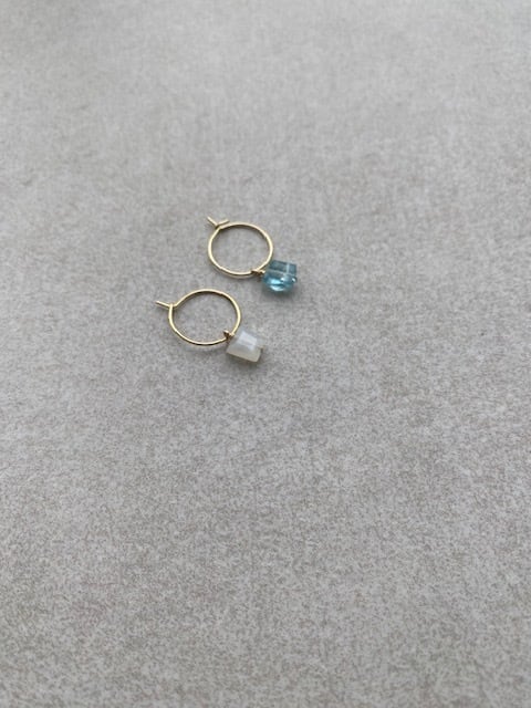 ご自身やお子様、大切な方の誕生石を身にまとうピアス。 輝き・色・形が惹かれるものを世界各国より集めた天然石を合わせ、付け替えが自由なチャーム式のピアスにお仕立て致しました。 ご自分の誕生石に、背中を押してほしい石言葉の石のチャームをそろえて、その日の気分で付け替えたり。 家族の誕生石のチャームを少しずつ集めたり。(一度こちらのピアスをご購入いただいたかたは、チャームのみのご購入も可能です。) フック型ではなく、硬めのサージカルステンレスのミニフープ型でお仕立ておりますので、スポーツの際にも外れにくく、負担になりにくいピアスです。 スポーツする方に着けていただいた記事はBlogでご覧ください。 それぞれの意味を持つ天然石がそっと耳元であなたの背中を押してくれるようなピアスです。 また素材もサージカルステンレスなので、アレルギーの方にも、安心してお使いいただけます。 誕生石や石言葉はページ下部に一覧でございます。 ご参考にされてください。 GIFT BOXは別売りです。 [オーダー方法] 商品がお好みの金具であることを確認し、オプションのプルダウンで、お好きな天然石をお選びください。 mini hoop(1,500円)に誕生石1つ追加するごとに石の価格が加算されます。 金具: フープ(サージカルステンレス)、ワイヤー&マルカン(14kgf) 天然石size:4〜9mm 重さ:約1g ※こちらは2個セットの商品です。天然石を2個以上お選び下さい。 ※天然石によって価格が変わります。プルダウンでご確認の上お選びください。 ※天然石は種類により、大きさ、形状が様々です。バランスを見ながらデザイナーがお仕立ていたします。 ※お届けに1週間~10日ほど頂きますが、チャームの天然石は海外から取り寄せているものも多く、素材の在庫がないものは、数週間お待ちいただく可能性もございます。その場合はご連絡差し上げます。(ご希望の日にちがございましたら備考欄にご記載ください。)
