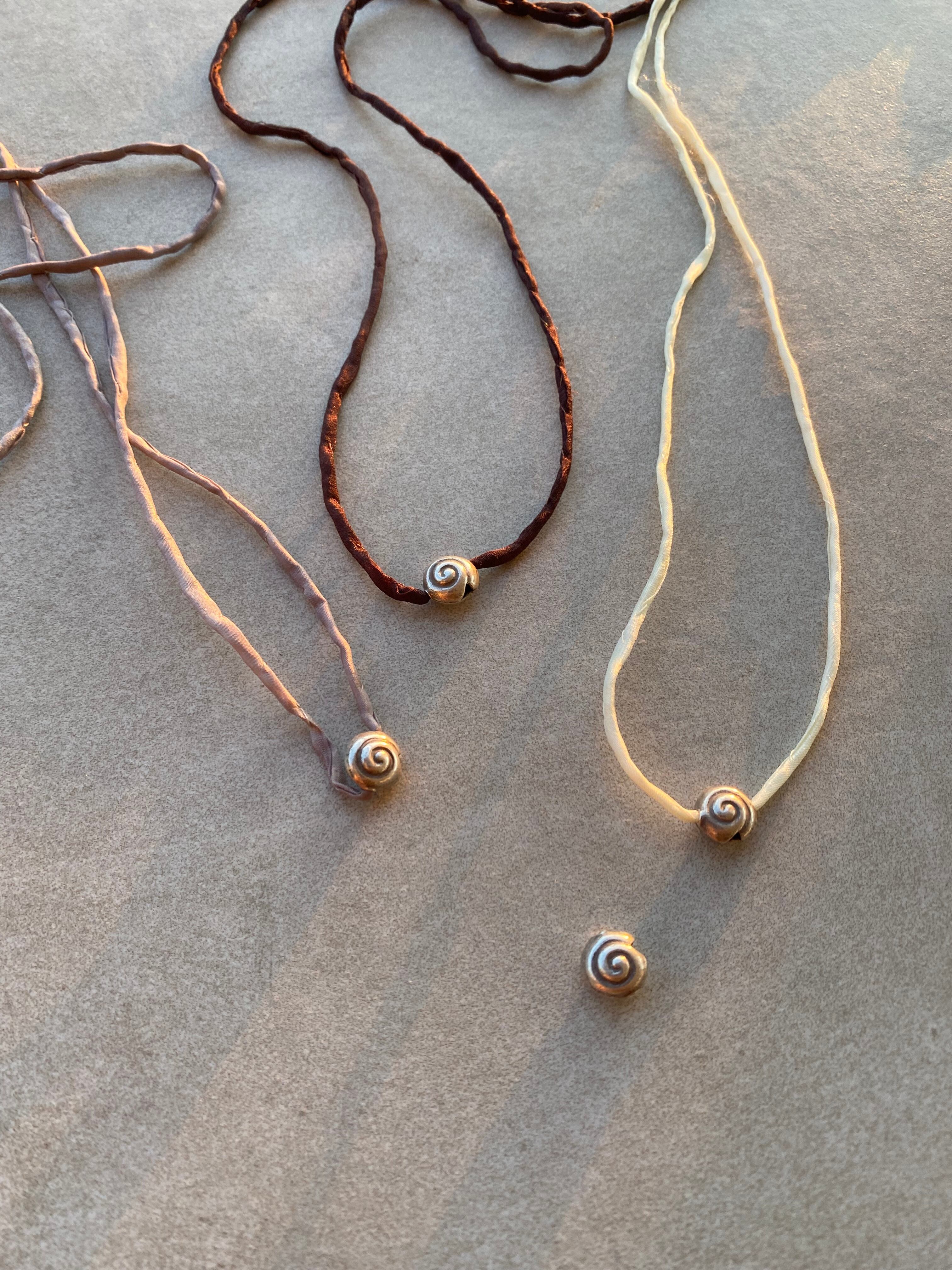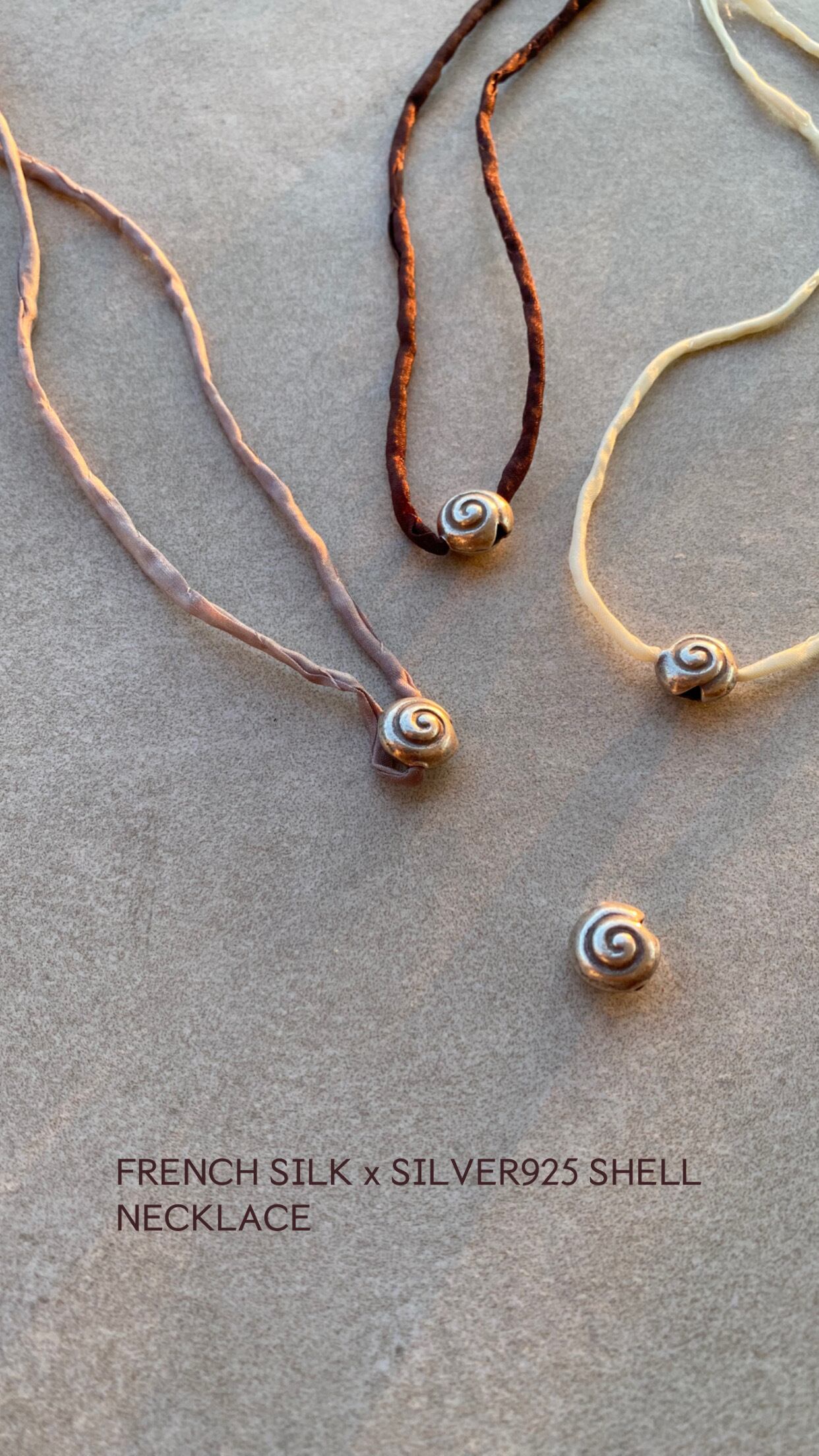 silk100%の生地を丁寧に紡いで作られたfrench silk codeに、SilverのShellトップを合わせたネックレス。