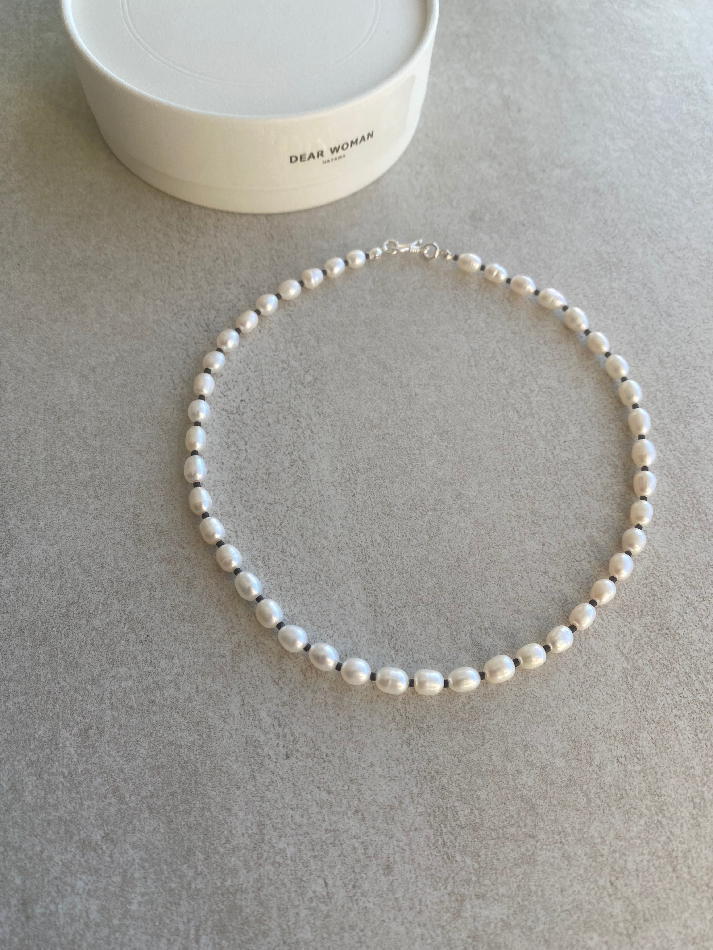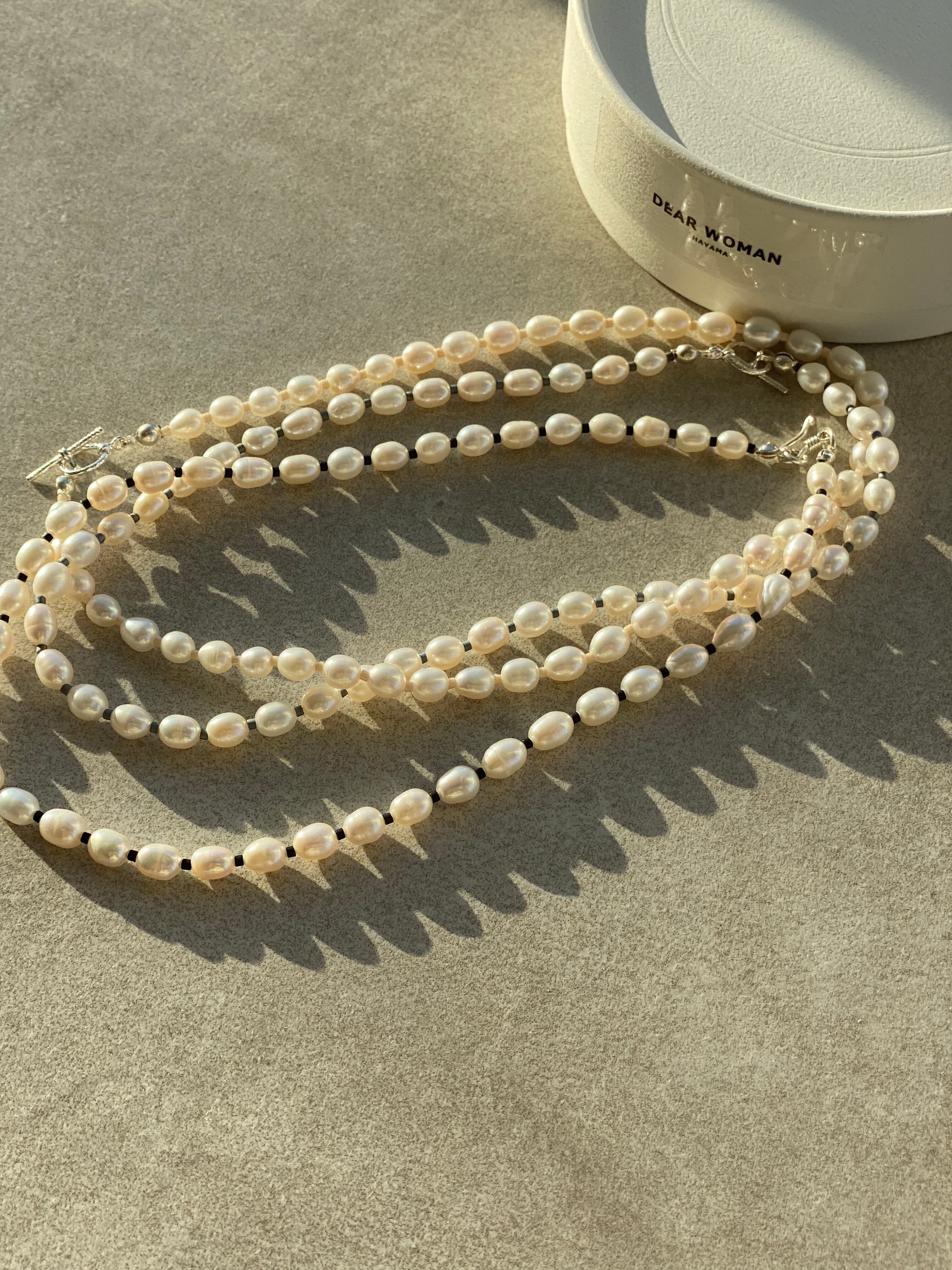 粒の形、そして艶が素晴らしくきれいな質の高い淡水パールに、丸みのない洗練されたcutのseed beadsを合わせることで、フォーマルだけではなく、カジュアルにも相性よく普段使いできるネックレスに仕上がりました。